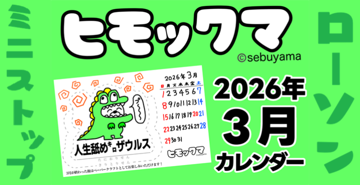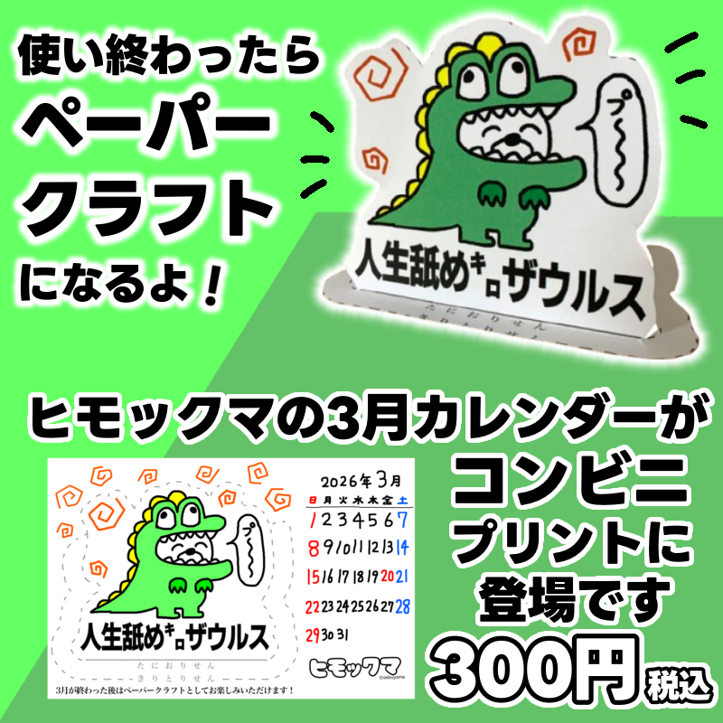 ヒモックマの2026年3月カレンダーが、コンビニのマルチコピー機でプリント開始しました!