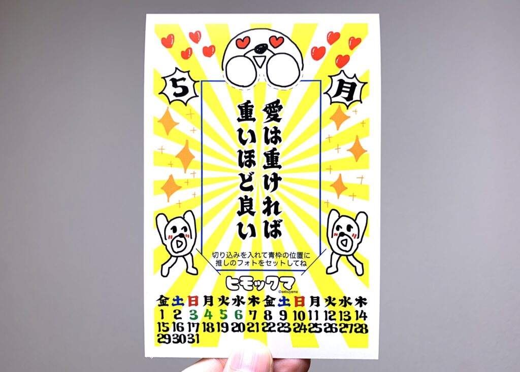 ヒモックマの2026年5月カレンダーが、コンビニのマルチコピー機でプリント開始しました!